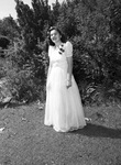 "High school graduates of the season who have been moving in a circle of gay parties". "The central figure is Miss Mary Ellen Arnold, Arlington Heights High School graduate, who was the honoree at a party given by Mrs. Jack Krause, 5024 Collinwood Avenue". Ms. Arnold is centered in the photograph. She is wearing a white dress with flowers on the right side of her chest. She is smiling broadly at the camera with her arms at her side. Her hair is half up and half down, and she is wearing a watch on her left wrist. She is standing in the grass with buses behind her.