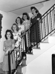"High school graduates of the season who have been moving in a circle of gay parties". "On the steps, five graduates of Amon Carter Riverside High School, who entertained the June class at a dance at Virginia Lodge. Left to right, Misses Betty Jane Jefferson, Jean Rentz, Dorothy Ward, Betty Childs and Betty Tyson". Ms Jefferson is at the bottom of the steps. Her left arm is on the railing and her right hand is on her left wrist. She is wearing a neutral colored dress, a small necklace, a ring on her right ring finger, and a bracelet on her left wrist. Her hair is half up and half down, and she is smiling and facing the camera. Ms. Rentz is behind Ms. Jefferson. She is wearing a white floral dress with long sleeves. She is a small necklace on, and her hair is half up and half down. She is facing the camera and is smiling. Ms. Ward is standing behind Ms. Rentz is wearing a white floral dress that is short sleeved. Her left hand is on Ms. Rentz left arm, she has a watch on her left wrist, and she is smiling and facing to the left of he camera. Ms. Childs is behind Ms. Ward. She is wearing a light dress, large white pearls, and has her hair half up and half down. Her left hand is on Ms. Ward left arm, and she is wearing a small watch and a ring on her left ring finger. Ms. Tyson is standing behind Ms. Childs. She is wearing a black dress with white polka dots. The collar is frilly and the dress comes below her knees. Her hair is half up and half down, her hands on on the rail, and she wears a ring on her left ring finger. She is facing the camera and smiling. They stand on a white curved staircase with black railing and wood steps.