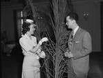 John Score (right), son of Doctor and Mrs. J. N. R. Score, and Miss Laura E. Hill, daughter of Mr. and Mrs. J. R. Hill, were among the attendees at a gathering of prominent Methodist clergymen and layworkers. They are facing each other, standing in front of a tall potted plant. Miss Hill is wearing a blazer, skirt, hat and gloves. Mr. Score is wearing a suit with a floral necktie.
