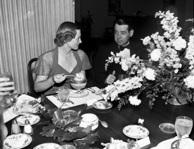 Guests dining at Mrs. Katherine Kingsbery Stripling's 89th birthday party. On the dining table are plates, cups, and a floral centerpiece. A man and a woman are sitting next to each other, having a conversation.