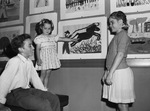 Brian Moran and Jayne Haynes (right) look on while Sara Haynes points to a picture at the Fort Worth local children's art show. Behind the group is a wall with paintings created by children from public and private area schools. Mr. Moran is seated and wearing a long sleeve shirt and slacks. Jayne Hanes, standing, is wearing a skirt and sweater. Sara Haynes, also standing, is wearing a patterned dress and is pointing at one of the paintings. This photograph was published in the May 1, 1942 morning edition of the Star-Telegram.