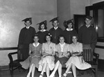 Nine boys and girls at Lena Pope Home ended their high school days this year, graduating either in February or June from Arlington Heights High School. February graduates are sitting on a wood bench in the front row, left to right, Eva Stark, Sybil Perryman, Bettye Passmore and Eva Mae Crenshaw, Members of the June graduating class were, standing behind the bench in cap and gowns, Walter Richey, Janice Huffines, Delbert Briley, Gloria Pullen and Carl Defidaugh. Published in the Fort Worth Star-Telegram evening edition, June 1, 1942.