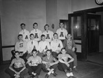 Lena Pope Home can form its own Letermen's club. It has 13 boys who lettered this year in athletics at Arlington Heights High School or W. C. Stripling Junior High School. The lettermen, their sports and their schools are: sitting cross legged on the floor in the front row, left to right, Chester Maxwell, softball, Stripling; Harold Killough, softball, Stripling; Bobbie Keller, football, basketball and track, Stripling; and Odice Amyett, softball and football, Stripling. Sitting in chairs in the middle row, Joel Amyett, manager of football team, Stripling; Walter Richey, manager of baseball team, Arlington Heights; Nelson High, basketball, Arlington Heights; Carl Fickle, manager of football and basketball, Arlington Heights; and Dale Hand, football and baseball, Stripling. Standing in the back row, Euless Phillips, basketball; Earl Fickle, football and baseball; Dan Jaques, football and track; and Carl Defibaugh, football, basketball and track, all of Arlington Heights. Published in the Fort Worth Star-Telegram evening edition, June 1, 1942