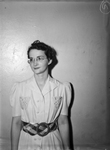 The Panther City Philatelic Society is electing new officers. Mrs. E. L. Frazior has been named the new secretary-treasurer of the society. She is standing against a wall, wearing a button-up dress with a wide belt around her waist.