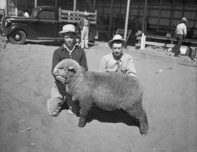 Sand Hills Stock Show, Odessa. Lewis Milton Smith and County agent C. Snell and his prize winning ewe lamb. Both the men are seen to be wearing hats as they kneel down next to the lamb.