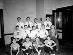 Lena Pope Home can form its own Letermen's club. It has 13 boys who lettered this year in athletics at Arlington Heights High School or W. C. Stripling Junior High School. The lettermen, their sports and their schools are: sitting cross legged on the floor in the front row, left to right, Chester Maxwell, softball, Stripling; Harold Killough, softball, Stripling; Bobbie Keller, football, basketball and track, Stripling; and Odice Amyett, softball and football, Stripling. Sitting in chairs in the middle row, Joel Amyett, manager of football team, Stripling; Walter Richey, manager of baseball team, Arlington Heights; Nelson High, basketball, Arlington Heights; Carl Fickle, manager of football and basketball, Arlington Heights; and Dale Hand, football and baseball, Stripling. Standing in the back row, Euless Phillips, basketball; Earl Fickle, football and baseball; Dan Jaques, football and track; and Carl Defibaugh, football, basketball and track, all of Arlington Heights. Published in the Fort Worth Star-Telegram evening edition, June 1, 1942