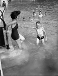 Miss Corinna Jordan, lifeguard, instructing J. Don Wright in art of swimming.