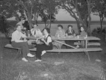 Possum Kingdom Lake. Mineral Wells group on picnic; Mr. and Mrs. Louis Gambril at left foreground. Back of the table, left to right, Tommy Collins. Man eating sandwich is R. D. Collins, Miss Constance Plemmons, Mrs. Collins and Mrs. Fred Brown.