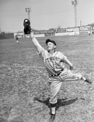 Image shows Fort Worth Cats baseball player Charles (Chuck) Baron in action shot. He is a recruit from Pensacola and a newcomer playing for the Fort Worth Cats. He is standing on the field, in uniform, catching a baseball in his glove. Published in the Fort Worth Star-Telegram morning edition March 23, 1940.