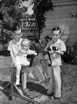 "The three sons of Doctor and Mrs. I. P. Barrett, 3819 Race Street, who have accompanied their parents to Austin, where Doctor Barrett will teach this summer at the University of Texas. The lads are Rough Rider Jimmie, who is 2, and the twins, Bob, with the puppy, Tuffy, and Bill. The twins are 6." Young Jimmie is sitting on what appears to be a homemade rocking horse. He is wearing a light-colored jumpsuit, light-colored socks, and light-colored shoes. The twins are wearing matching slacks and button-up short-sleeved tops. Each of them has his hair slicked to the side. Bob is holding a puppy and wearing woven sandals. Several plants can be seen in the background.