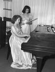 Katherine Morgan, pianist, and her sister, Josephine, flutist. "Katherine Morgan, daughter of Mr. and Mrs. R. H. Morgan, 2245 Fifth Avenue, will be presented in a piano recital at 4 p. m. Sunday by her teacher, Mrs. Orlin R. Morse, at her studio, 1204 Buck Street. Josephine Morgan, Flutist, will assist her sister. She is a pupil of Mrs. Jane Gilliam Tichnor. Katherine Morgan won first place in class in the Euterpean contest". Katherine Morgan is on the left side of the photo sitting behind a large dark piano that is facing to the left. She is wearing a sleeveless silky looking dress, has her hands on the piano keys, and is looking down at the piano with her feet near the piano pedals. She appears to be wearing a necklace, is sitting in a dark chair, and he has hair down and parted to he left. Standing behind her is her sister Josephine Morgan. She is also wearing a silky looking dress, but her dress has puffy sleeves. She is holding and looking down at the flute in her hands, and also has a necklace on and her hair down and parted to the left. Behind the girls are striped curtains on the left and polka dot curtains taking up the majority of the background. The entire room is carpeted.