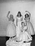 Recreation Department. Spring Recital. Left to right, Alice Tomlin, Joy Maloy and Betty Maloy. In front is Janann Hart. All are seen wearing dresses as they dance their routine.