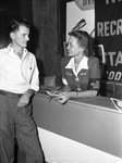"Avengers of Pearl Harbor." Mrs. Alfred E. Coffey signing up O. C. Heairren, 21, of Breckenridge, Texas. "Even an army wife was boosting the Navy's "Avengers of Pearl Harbor" company here Thursday as USO workers were stationed in theater lobbies to give out information about the service. Mrs. Alfred E. Coffey (above), 3800 Clarke Avenue, wife of an army captain now in Australia, signed up O. C. Heairren, 21, of Breckenridge, along with several other good prospects". Mrs. Coffey appears towards the center of the photograph. She is wearing a button up shirt with two breast pockets, big buttons, and a white collar. Her hair is pulled back, she is wearing a Navy Recruit Service arm band, and is holding a pen and piece of paper. Her wedding ring is visible on her left ring finger, and her watch is visible on her left wrist. She is leaned over a counter and is looking at Mr. Heairren and smiling. To the left of the picture is Mr. Heairren. He is wearing a white button up shirt with a undershirt slightly visible, has a pen in his left breast pocket and a watch on his left wrist, and is wearing slacks with a thin belt. He is leaned against the counter and is looking at Mrs. Coffey. On the counter you can see pieces of paper about the Navy. In the background you can see banners and signs about recruiting services.