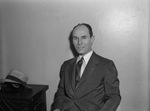 Doctor Eugene T. Stegall, of Panther City Lodge. Doctor Stegall is sitting in front of an empty wall, wearing a dark suit with a striped tie. Next to him, at left, is a set of drawers on top of which is a telephone and a hat.