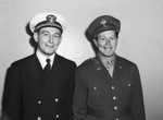 Charles Tandy (left) and Alfred R. Tandy, son of Mr. and Mrs. D. L. Tandy. "Charles David Tandy and Alfred R. Tandy, sons of Mr. and Mrs. D. L. Randy of 1716 Berkeley Place, are visiting Fort Worth on leave from the armed forces. Charles, an ensign in the Navy has been stationed in the Secretary of the Navy's office in Washington. Alfred Tandy arrived Saturday morning from Tulsa where he has been attending a primary training school of the Army Air Forces". Charles Tandy is on the left wearing his black Navy service jacket, a white undershirt and black tie, and his service hat. Alfred Tandy is on the right wearing his Army Air Force service jacket, and tan undershirt and tie, and his service hat. Both individuals are centered in the photo and smiling at the camera.