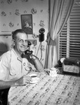 Locksmith R. E. Riley at home. "Locksmith Riley notices that these are challenging times. He's gone out of business and got himself a job at Consolidated. His home phones still ring, but he's trying to get all his customers to be careful and not lose their keys for the duration." Mr. Riley is sitting at a table in what appears to be his kitchen or dining room. He is holding the handset of a rotary dial telephone that is mounted on his wall, along with a full teacup and saucer. What appears to be a sugar bowl is lying on the table near his elbow, which is also resting on the table, along with a metal-finished toaster. Mr. Riley is wearing a short-sleeved button down shirt, a wedding band, and a pin that says "33." His hair is slicked back. He smiles and looks into the camera, appearing to be mid-conversation with someone on the telephones. Behind him is a wall covered with a recurring country motif, a paper towel dispenser, and a painting of what appears to be a Wire Fox Terrier chasing butterflies. Sheer gingham check curtains and a set of blinds are hanging in the windows. A geometric floral pattern tablecloth is covering the table.