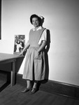 Mrs. T. H. Thomason is modeling volunteer-nurse uniform. "Modeling the uniform of the Volunteer Nurse's Aid Corps is Mrs. T. H. Thomason, member of the board and of the recruiting committee. Red Cross is asking for a large number of volunteer applicants." Mrs. Thomason is wearing lace-up heeled slingbacks, a light-colored apron-dress with deep pockets, a lighter-colored undershirt with a notched collar, and a nurse's cap. She is smiling, with one hand in her pocket and the other resting on a table as she looks into the camera. A poster advertising the Red Cross is sitting on the table, propped against the wall.