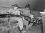 Reserve Officers' Training Corps (R.O.T.C.) cadets at Camp Dallas. Arlington Heights High School students and Army privates Tommy Seymour, left, and Bill Meeker, clean their rifles. The boys are sitting on a bunk inside a tent. This photograph was published in the June 11, 1942 evening edition of the Star-Telegram.