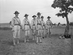 Reserve Officers' Training Corps (R. O. T. C.) cadets at Camp Dallas. The cadets are members of the Third Battalion, composed of 135 students from Fort Worth high schools. The soldiers are (front) Lieutenant Colonel Miles Vaughan of Polytechnic High School. Others, left to right, are Captains James Nesbitt, Amon Carter Riverside High School, Billy Byas and Eddie Engleman, both of North Side High School, Louie Turner and Joe Phillips, both students at Paschal High School. The soldiers are in uniform, standing and holding bayonets. This photograph was published in the June 12, 1942 evening edition of the Star-Telegram.
