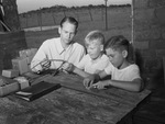 At Camp Holland, Jimmy Byrnes, left, craft instructor, shows Ellis Ivey, 11, center, how to plait a belt. At right is A. J. Welch, 9, who is making a wooden decorative pin. They are outdoors, sitting at a wooden table. On the table are a binder, boxes, and various tools for making the crafts. Jimmy is wearing a coat zipped up to the collar. Ellis is wearing a v-neckline shirt. A. J. is wearing a t-shirt. Camp Holland is a Young Men's Christian Association (YMCA) summer camp.