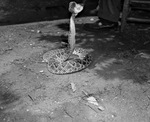 "You could chunk a rock from the Santa Fe Depot and hit the front porch of the rooming house where Hitler, the Mikado, and Charlie....- whose name really ought to be MacArthur- coil, and rattle and slither- and scare the daylights out of most people. This trio, plus a rather anemic one with insufficient personality to rate a name, are the most impressive mess of snakes you ever saw and they're viewed with downright affection by their owner, J. O. Lane, a sort of self-styled medicine man." A snake named "The Mikado" appears to be held erect by a snake hook, its body twisted. The snake's mouth appears to be ajar. Dirt and plant debris are littering the foreground. In the shade of the top right corner are a pair of feet and a couple of chair legs.