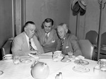 "Making plans for the Texas visit of 14 war heroes next month are, left to right, Mayor I. N. McCrary, Frank Weatherford and R. J. O'Donnell. The heroes will be presented to the public at a rally at Arlington Downs, tentatively scheduled for July 2." The group is sitting together, side-by-side, at a dining table. All three of them are looking at a multiple-page/paper-clipped document, with expressions ranging from surprise to mild amusement. There is a spherical pitcher resting on the table, along with salt-and-pepper shakers, a plate of crackers, plates with pats of butter, several glasses of water, a couple of teacups with saucers, a dish of what appears to be fruit salad, and more. There are a couple of coat racks in the background, one has several hats hanging. Each one of the individuals is wearing a suit and tie.