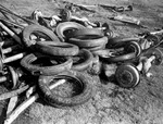 "This pile of abandoned tires, typical of the kind sought in the scrap rubber collection drive which opens Monday, was located by The Star-Telegram photographer in Handley, Texas. President Roosevelt has asked that these and others like them be turned in for reclaiming." Tires, along with what appear to be automobile axles, mufflers and other automobile scraps are lying in a field. The parts appear to be used and temporarily forgotten.