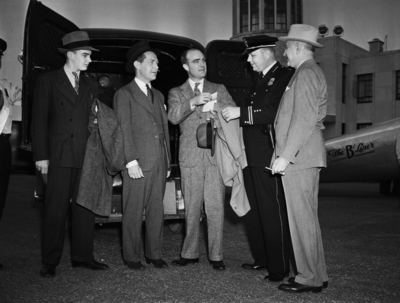 Amon Carter Senior, right, standing with four other men outside of a vehicle.