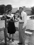 Mrs. Hassell Riley, secretary of the Poolville Cemetery Association, and J. W. McConnell, president, are standing on either side of a well. "Mrs. Hassel Riley... and J. W. McConnell... meet at the well, in use by the town for 50 years, near where a memorial shaft to Poolville's beloved family doctor was dedicated Sunday." Mrs. Riley is wearing a black knee-length dress embellished with a lace collar and sleeves, along with a black fascinator and black lace up shoes. She is holding a box. Her shoes and the pump are both glistening, perhaps indicating recent usage of the pump. Mr. McConnel appears to be holding a glass of water, facing a smiling Mrs. Riley. He is wearing a light button-up shirt, a dark tie, a pair of light colored trousers, a belt, and practical shoes. Parked automobiles and business storefronts are composing the background.