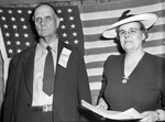 "They helped turn a Springtown reunion into a patriotic rally Sunday. John W. Nix. committeeman, and Mrs. Maude McClary Sneed, re-elected secretary treasurer. Both are from Fort Worth, Texas." Both Mr. Nix and Mrs. Sneed are standing in front of an American flag. Mr. Nix is wearing a "Howdy!" name tag, a suit, striped undershirt, tie, belt and belt buckle that says "Nix," as he is looking sternly off into the distance. Mrs. Sneed is wearing a dress, brooch, spectacles a watch, and a hat as she is smiling. She is also looking off into the distance.