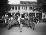 "These flags of the Allied Nations, borne by Boy Scouts, shared honors with 'Old Glory' Sunday evening at Elks' Lodge- American Legion ceremonies at Burnett Park, which brought to a dramatic close the city's first observance of a wartime Flag Day in 24 years." A group of boy scouts is standing outside the Elks' Lodge- American Legion building holding flags. All but one of the young men stand in a U-shaped formation holding the flags of the Allied Nations, while one young man stands in the center holding the American Flag.