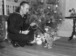 Christmas Is When it's Most Convenient: Jake Smith is a Yeoman in the U. S. Navy. His parents promised a Christmas tree when he came home on leave, no matter what the calendar said. Smith, who was aboard the aircraft carrier Lexington, lost in the Coral Sea, came home Monday and found it bedecked with his favorite decorations. He is shown returning home, with him here is Toy, his dog. Toy is sitting on his hind legs, wearing a halter and a leash. Yeoman Smith is dressed in his navy uniform. There is decorated Christmas tree in the room. Published in The Fort Worth Star-Telegram morning edition, June 16, 1942.