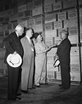 Quartermaster Depot. Colonel John S. Chamber, commander of the Fort Worth Quatermaster Depot, (in uniform) showing business man how to store item. The men, left to right are, Marshall A. Fuller, John H. Hall and A. A. Lund.