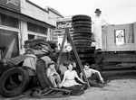 M. C. Davis (standing in truck), brother and sister due James Mike & Dora Alice Calhoun, and Vernon Roberts (seated, left to right), shown with a pile of scrap rubber for the scrap rubber campaign driven by President Roosevelt. "Here's more than a ton of the stuff Uncle Sam is looking for in his scrap rubber campaign. A little rummaging at Bewley Mills rounded up 2,380 pounds of discarded tires, tubes, and other scrap, which was loaded by M. C. Davis (standing in truck) and hauled to Ben Eastman's Hill Crest Station. A big truck tire that had seen its best days was added to the collection by James Mike and Dora Alice Calhoun, 1809 Clover Lane, and Vernon Roberts, 1712 Clover Lane (seated left to right in the photo). The tire was given them by H. Calhoun, father of the two children, who works for L. J. Miles Construction Company." Mr. Davis is standing on a truck bed next to a tall stack of tires that reaches his shoulders. The three children are seated near a tripod scale among a collection of hoses and tires.