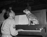 Gailey, Gordon (Cpl.); Dogs; Mascots; Pianos; Sheet musi; Military uniforms; Bands; Musicians; Emergency Relief Show; Fort Wolters (Tex.)