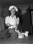 Sally Carrigan packing a kit for the Red Cross. "Part of the triple play- baseball to ice hockey to the Red Cross. Sally Carrigan, wife of the Fort Worth Rangers ice hockey manager, Gene Carrigan, packs the kits the Red Cross gives to soldiers departing for foreign service. The war relief game which the Fort Worth Cats will play to the Red Cross to pay for these kits, the cost of which is not included in the regular Red Cross budget. The kits contain a variety of items a soldier far from home finds mighty handy." Sally is wearing a Red Cross nurse's uniform as she prepares to stuff a pair of scissors into a drawstring bag. To her left, several small boxes of sewing supplies are lying on the table. Behind her is a painted scene, which seems to be some kind of prop, of a country home with a couple of dogs. One of the dogs is howling at the full moon.