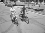 Two bicycles and a luggage basket for the baby solve the transportation problem of Mr. and Mrs. W.T. Oxford, 3855 Mount Vernon. They're shown here, with 2-year-old Barry in his basket as they set out for Sagamore Hill Baptist Church, a mile away, each Sunday morning. and they make a return trip Sunday night for Baptist Training Union. Oxford is superintendent of the young people's department at the Sunday School, Mrs. Oxford is one of his teaching staff, and Barry is in the cradle roll.