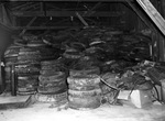 36,000 pounds of scrap rubber in the Sinclair bulk plant gathered during the scrap rubber campaign led by President Roosevelt. A heap of tires, hoses, tubing, and other rubber scraps are filling a room up to the rafters.