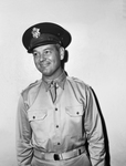 Lieutenant Amos Melton, of the United States Army Air Force, will leave Fort Worth, Texas, for Miami Beach, Florida, where he will attend officers school. He has been a member of the Fort Worth Star-Telegram sports staff for 14 years. He is shown standing in front of a blank wall, wearing a military uniform.