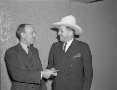 Veterans of Foreign Wars. Otis N. Brown, right, Greensboro, North Carolina national commander of Veterans of Foreign Wars (VFW) is shown wearing the "ten-gallon" hat local posts gave him and Judge Frank P. Culver Junior is shown handing him a deputy sheriff's commission conferred by Sheriff Carter.