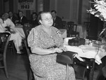 State Federation of Labor Convention. Mrs. Harry Acreman. Photograph depicting a woman sitting in a chair. She is typing on a transcription machine (stenograph or stenotype). Behind her in the room are people seated at tables. There is a banner on the wall that has the words: Galveston welcomes you in 1943. Published June 23, 1942.