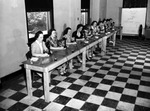 Seated at the Air Raid Control Center incoming calls table are form left to right: Mrs. Anna Bailey, Mrs. F. G. Thompson, Mrs. Sol Rosenthal, Mrs. A. J. Gibson, Mrs. W. T. Lloyd, Mrs. Uel Stephens, Mrs. A. J. A. Stone, Mrs. R. B. Snow, Mrs. J. Harrison and Mrs. Lola Dodson.