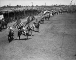 Scurry County Rodeo. Shot of horsemen carrying flags. "The flag ceremony during the grand entry at the Sixth Annual Scurry County Rodeo Friday and Saturday of last week attracted much attention. The camera caught some of the horses in motion with most of the flags of the United Nations plainly visible in the breeze."