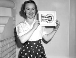 Mrs. Marcine Troutt is employed at the Fort Worth Chamber of Commerce. She is shown holding a "ten-percent of payroll" sticker. The sticker will be issued to firms with 90-percent of their personnel putting ten-percent or more of their overall payroll in United States War Bonds. Mrs. Troutt is dressed in a button-up blouse and a polka-dot skirt.