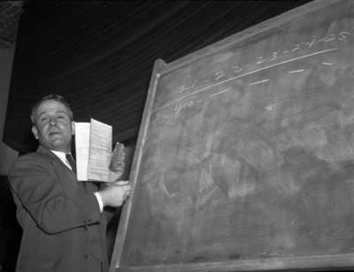 The Second session of the school for census enumerators got underway at Texas Christian University (TCU). Here in the picture is Sinclair Baker, assistant supervisor of the census district and teacher of the applicants, goes to the blackboard to illustrate a point.