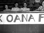 Jerry Kissinger (second from left) and Gerry Murphy (beside her on the right), spectators at the Red Cross benefit baseball game at LaGrave Field. Misses Kissinger and Murphy are sitting in the bleachers, where they have hung up a sign rooting for Fort Worth Cats pitcher Frank Oana. The sign has his name printed in large letters. Both women are wearing lace dresses and Miss Kissinger is wearing a pair of eyeglasses. On either side of them are other unnamed female spectators and behind them is a row of empty seats.
