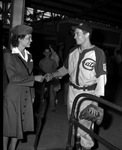 Bill Barisoff, right, new outfielder for the Fort Worth Cats, buying a ticket from Mrs. Alfred E. Coffey, left, to the Red Cross benefit game at LaGrave Field. Barisoff is wearing his Fort Worth Cats baseball uniform and Mrs. Coffey is wearing her Red Cross Motor Corps uniform. Other attendees at the game can be seen standing in the background.