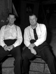 Milt Steengrafe (left) and Dusty Boggess, baseball umpires, holding their tickets to the Red Cross benefit baseball game at LaGrave Field. The two umpires are sitting next to each other, both wearing dark trousers, suspenders and dress shirts.