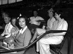 Mrs. Henry Love (left, foreground) attending the Red Cross benefit baseball game at LaGrave Field. Mrs. Love is sitting in the bleachers with a few other spectators who are smiling and looking on at the game. She is wearing a blouse, blazer and a skirt. She also has a small bow in her hair. On her lap is a purse and she is holding a sandwich in one hand and a piece of chicken in the other.