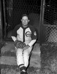 Joe Winfield, new pitcher for the Fort Worth Cats minor league baseball team. Winfield is sitting on the small steps outside of a fence gate. He is dressed in his Fort Worth Cats uniform and is wearing a baseball glove on his right hand. Around the steps are patches of dirt and grass.